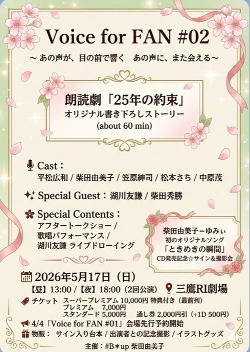4月4日、三鷹RI劇場にて朗読劇&ファンミーティング「Voice for FAN #01」が開催されました。昼公演(13:00)と夜公演(17:00)の二部構成で、昼公演は完売で夜公演も満席に近く熱気に包まれたイベントとなりました。