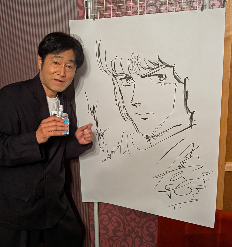 そして特別参加として、湖川友謙氏がライブドローイングで出演。さらに出演者の似顔絵制作でも協力し、その似顔絵の原画は会場で展示・販売され大いに盛り上げました。